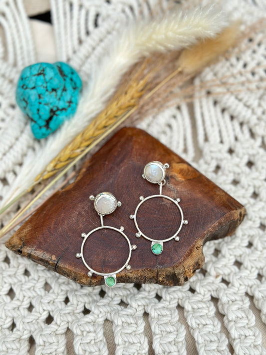 Circle Drop Earrings - Natural Pearls and Verde Valley - Sterling Silver .925