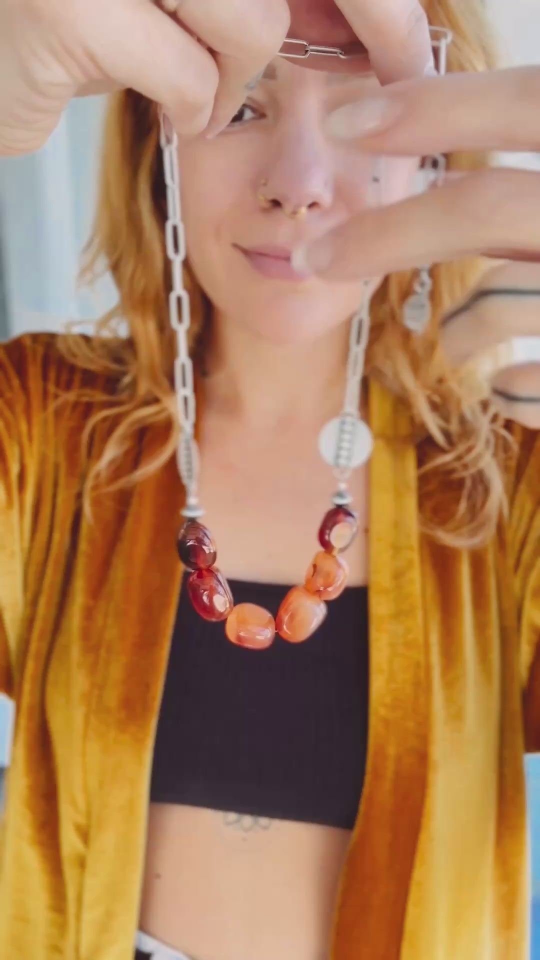 This necklace is entirely made with sterling silver, has a few silver beads and features these beautiful Carnelian beads. Is 19" long.